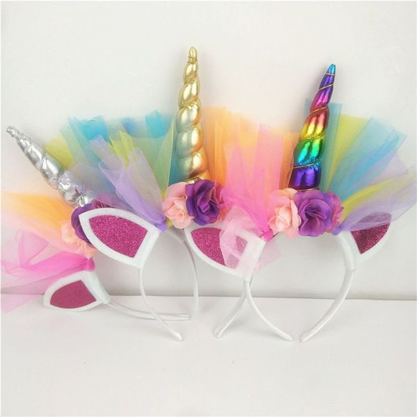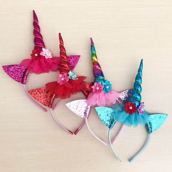 Us 2 45 5 Off 2018 Glitter Metallic Unicorn Headband Girls Chiffon Flowers Hairband For Kids Leaf Flower Unicorn Horn Party Hair Accessories In Hair